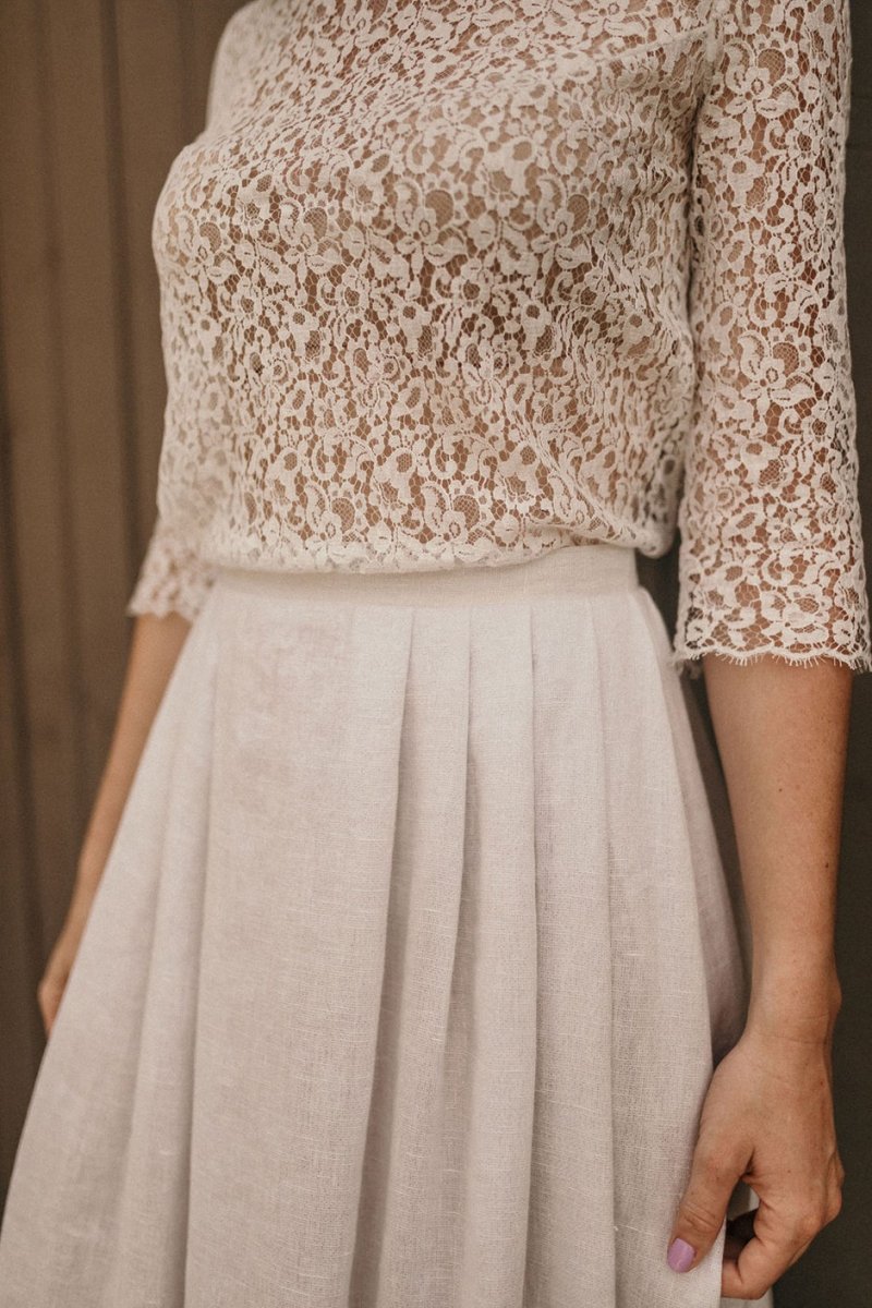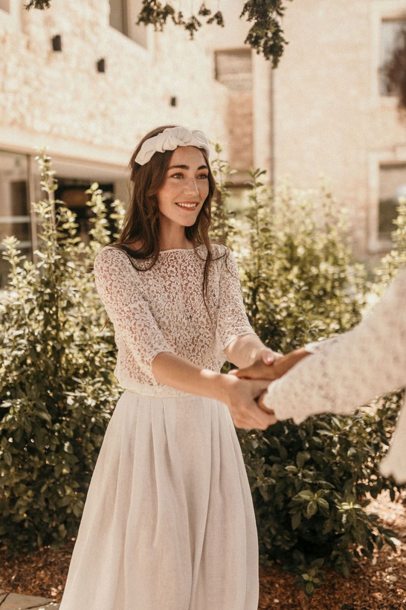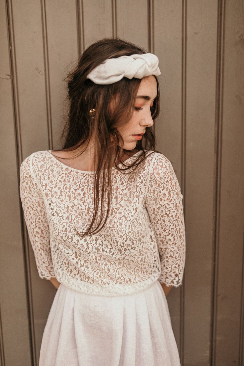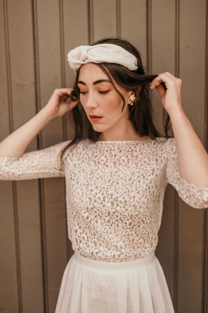 Le top ABELIA en dentelle de Calais à petit motif floral est une pièce parfaite pour le mariage civil ou le brunch ! Son encolure bateau et ses manches ¾ lui confèrent une allure chic.
