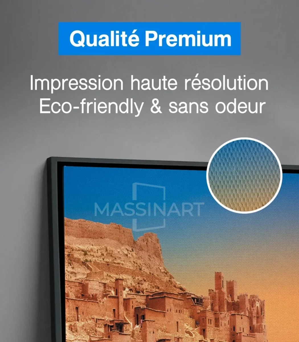 Découvrez nos tableaux exclusifs sur massinart.ma, alliant artisanat et modernité pour sublimer vos espaces. Chaque tableau est conçu à partir d’un châssis de 3 cm et d’une toile canvas artistique en coton (80 %), fabriquée en Allemagne. L’impression est réalisée en haute résolution avec des encres écologiques et sans odeur, garantissant une qualité exceptionnelle.