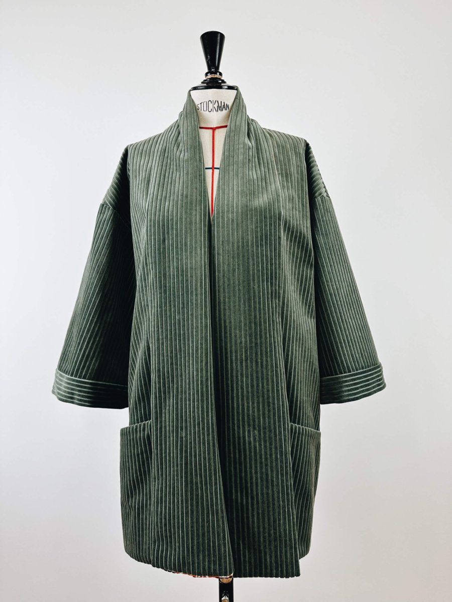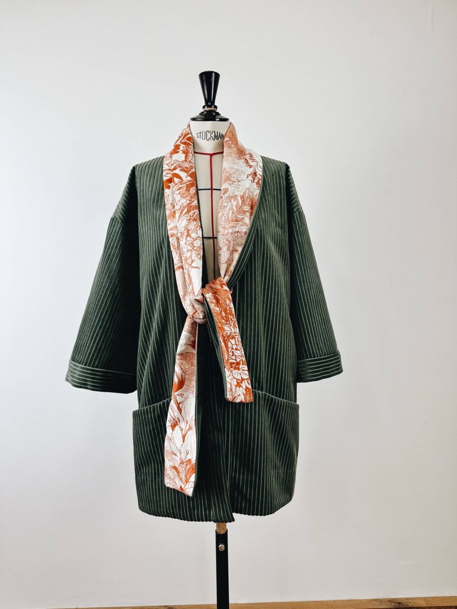 La coupe est optimisée pour limiter les chutes, et celles-ci sont utilisées dans les accessoires, détournées en bijoux textiles ou en complément sur d’autres créations. De plus, ce kimono a été pensé comme une pièce intemporelle et il se reporte sans modération pour de multiples occasions.