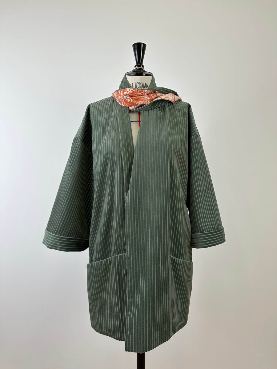 Une veste d’inspiration kimono avec des tissus d’exception et d’une allure folle avec sa coupe droite (qui va autant aux femmes qu’aux hommes !) et ses larges manches évasées 7/8 permettent de porter ce que l’on veut dessous ! Manteau de demi-saison ou sur-veste pour l’hiver, c’est une pièce versatile dans un style « effortless chic » avec beaucoup d’effet. Son col amovible peut être portée comme un col ou de multiples façon comme une écharpe. Les larges poches sont à la fois pratiques et distinguées et la doublure en satin de coton se pare d’un magnifique imprimé végétal.