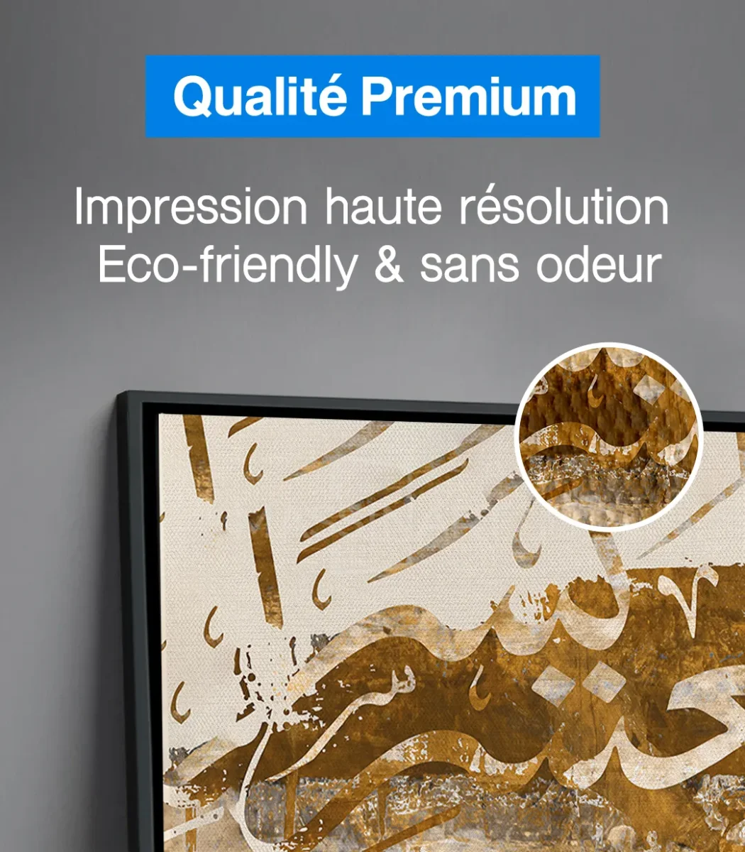 Découvrez nos tableaux exclusifs sur massinart.ma, alliant artisanat et modernité pour sublimer vos espaces. Chaque tableau est conçu à partir d’un châssis de 3 cm et d’une toile canvas artistique en coton (80 %), fabriquée en Allemagne. L’impression est réalisée en haute résolution avec des encres écologiques et sans odeur, garantissant une qualité exceptionnelle.