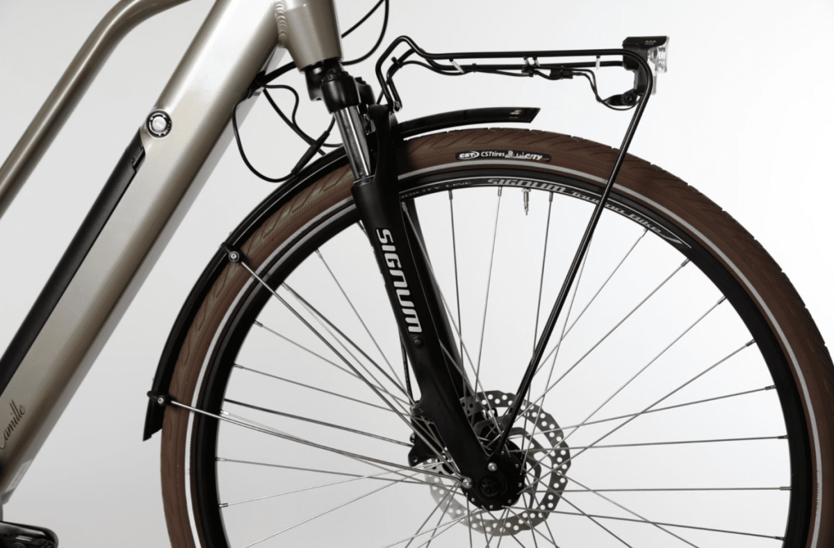La fourche Zoom CH141 avec un débattement de 55 mm et la tige de selle suspendue du Bicyklet Camille absorbent les irrégularités de la route, assurant une conduite sûre et confortable. Les pneus CST de 700x45c avec bandes réfléchissantes et la selle large Signum Trekking ajoutent au confort général.