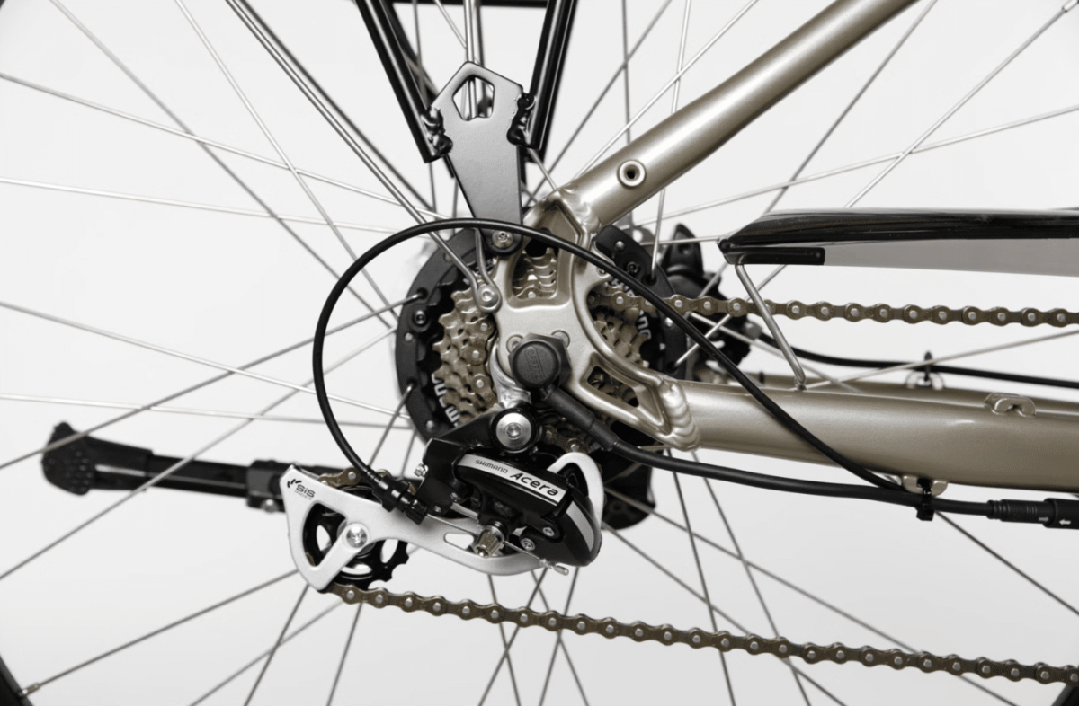 Ce modèle possède une transmission mixte Shimano, combinant des composants de la gamme Tourney, Acera, et Altus. Ce système à 7 vitesses permet une conduite fluide et adaptable à tous les terrains urbains.