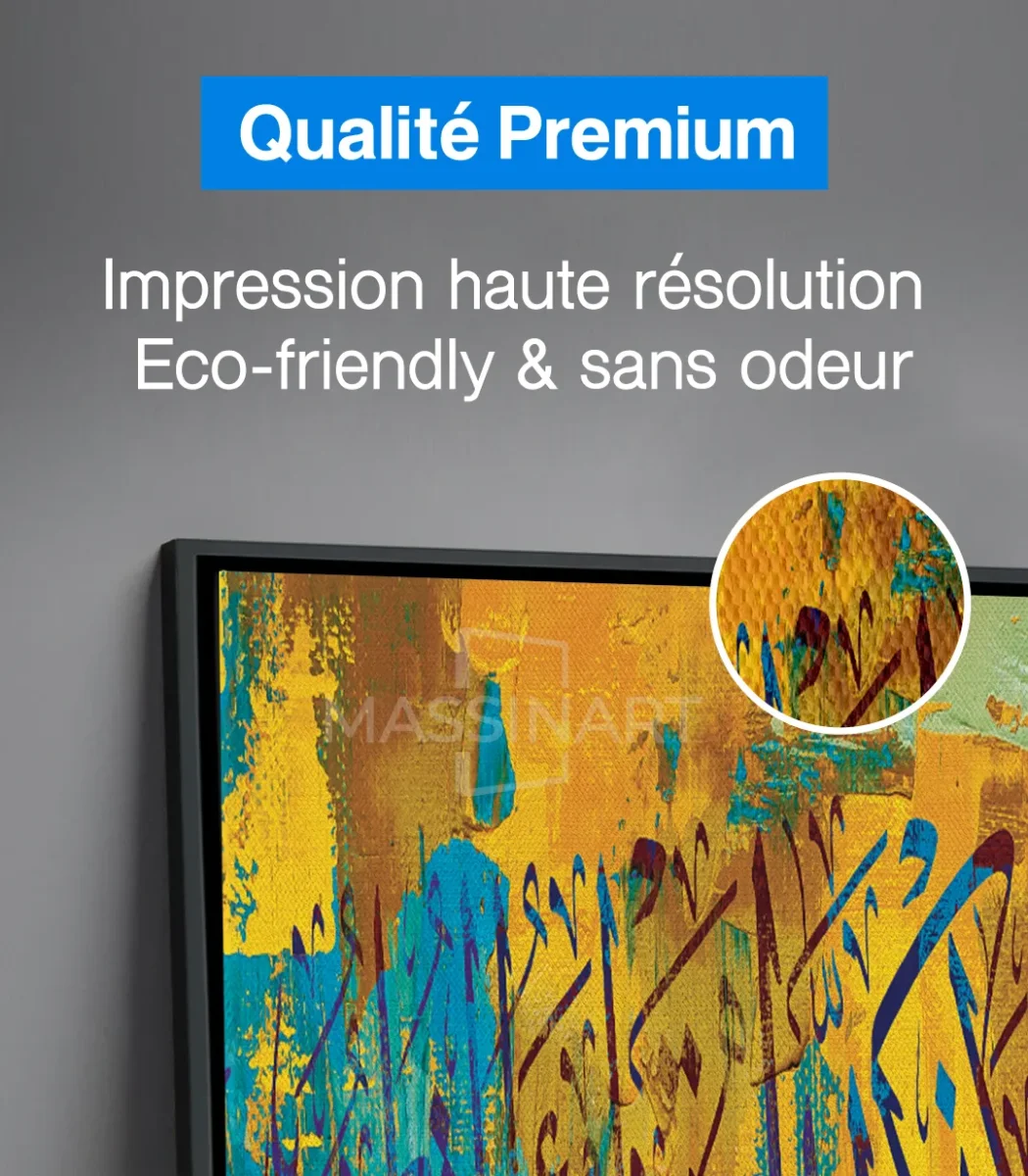 Découvrez nos tableaux exclusifs sur massinart.ma, alliant artisanat et modernité pour sublimer vos espaces. Chaque tableau est conçu à partir d’un châssis de 3 cm et d’une toile canvas artistique en coton (80 %), fabriquée en Allemagne. L’impression est réalisée en haute résolution avec des encres écologiques et sans odeur, garantissant une qualité exceptionnelle.
