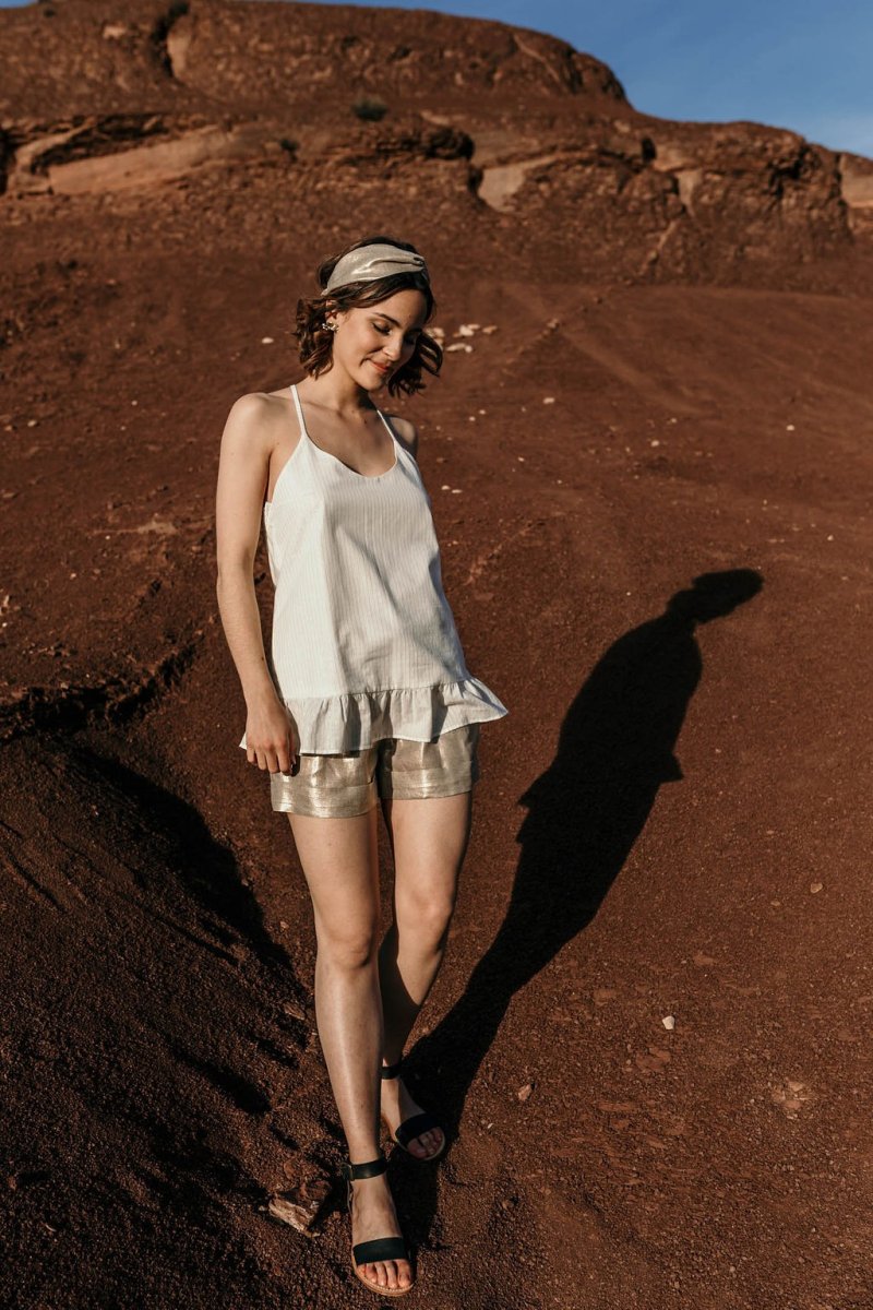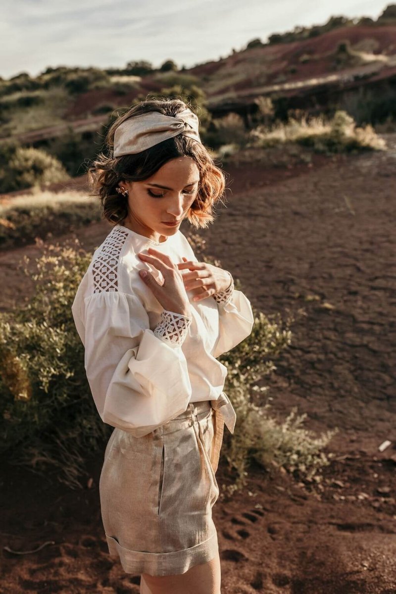 Vous retrouvez sur les bandeaux le lin Or de la robe HERA, le lin blanc cassé de la Jupe LIANE MIDI