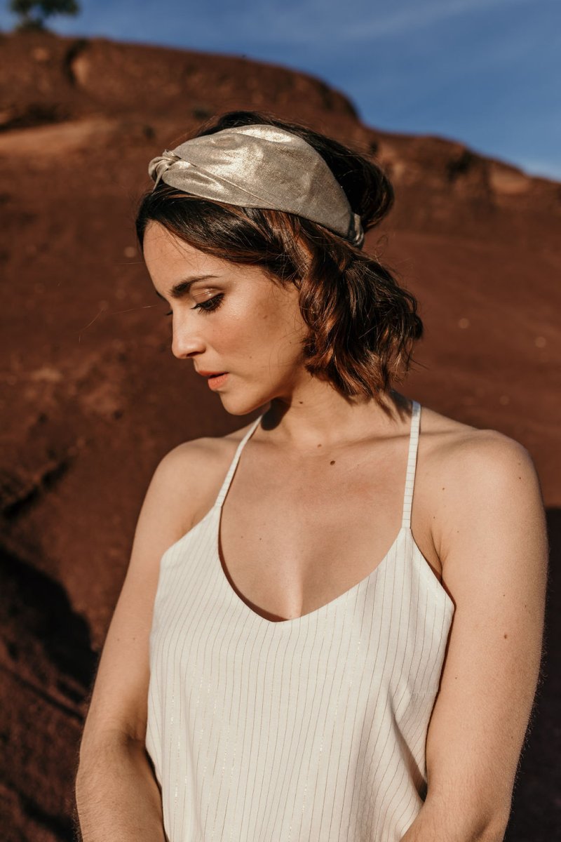 Notre conseil : Décliné en lin or, lin argent, ou lin blanc cassé parsemé de fil d’argent, c’est un headband à adopter pour les fêtes ou en version habillée pour le jour. Ses reflets dorés ou argentés illuminent le visage,.