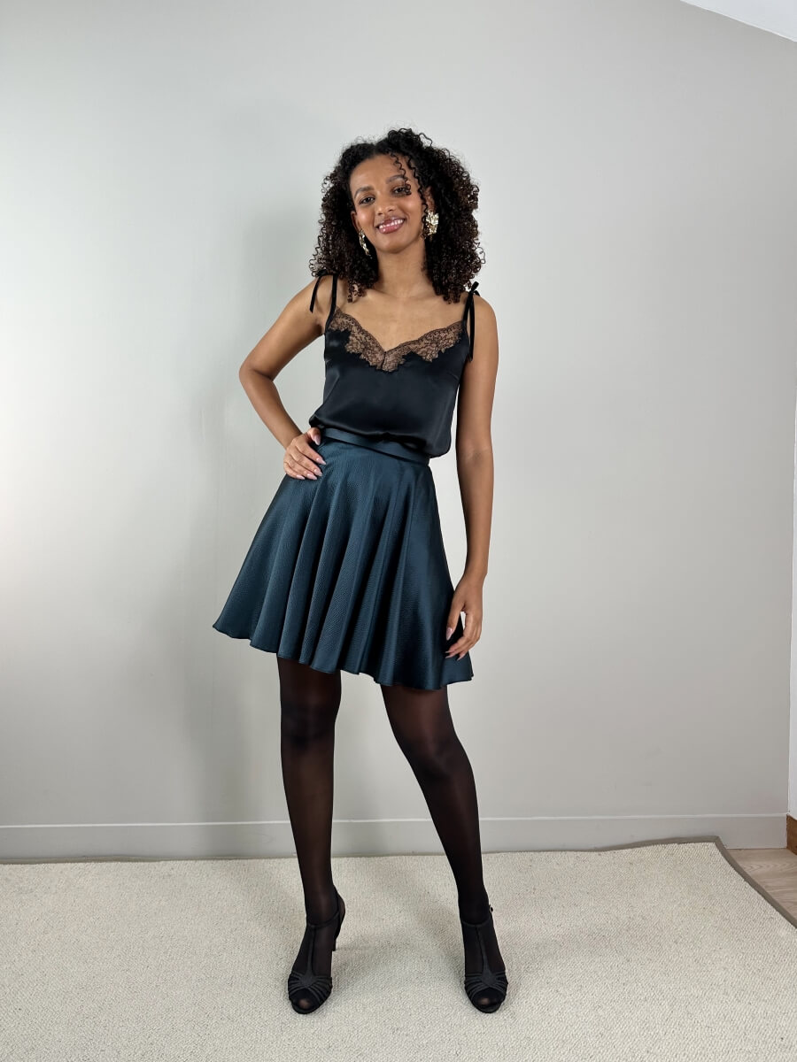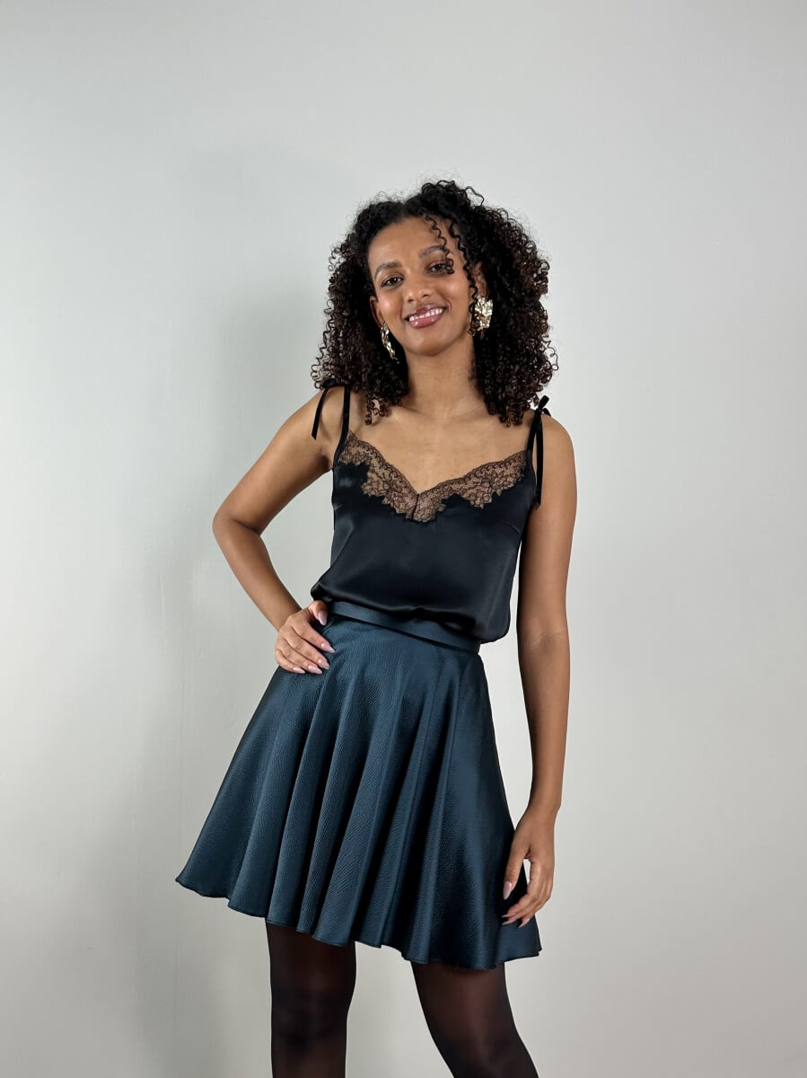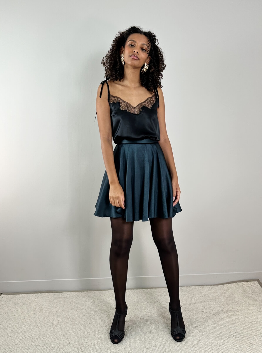 Un top raffiné dans un très beau satin de soie certifié biologique et incrusté de dentelle Chantilly noire, bretelles en rubans de velours noir à nouer. Le petit top parfait pour un ensemble du soir à la fois chic et décontracté.