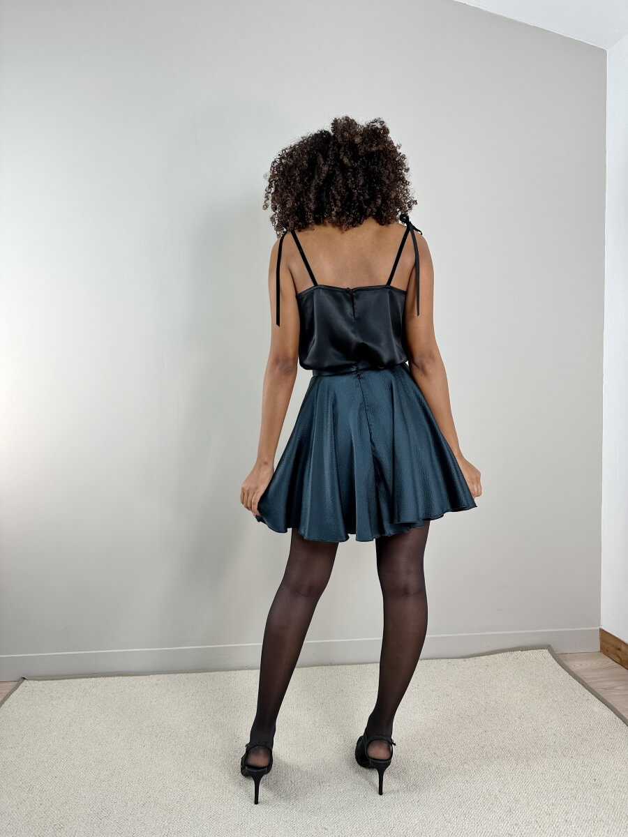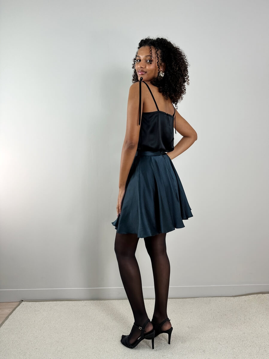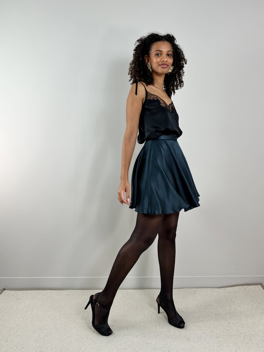 Un top raffiné dans un très beau satin de soie certifié biologique et incrusté de dentelle Chantilly noire, bretelles en rubans de velours noir à nouer. Le petit top parfait pour un ensemble du soir à la fois chic et décontracté.
