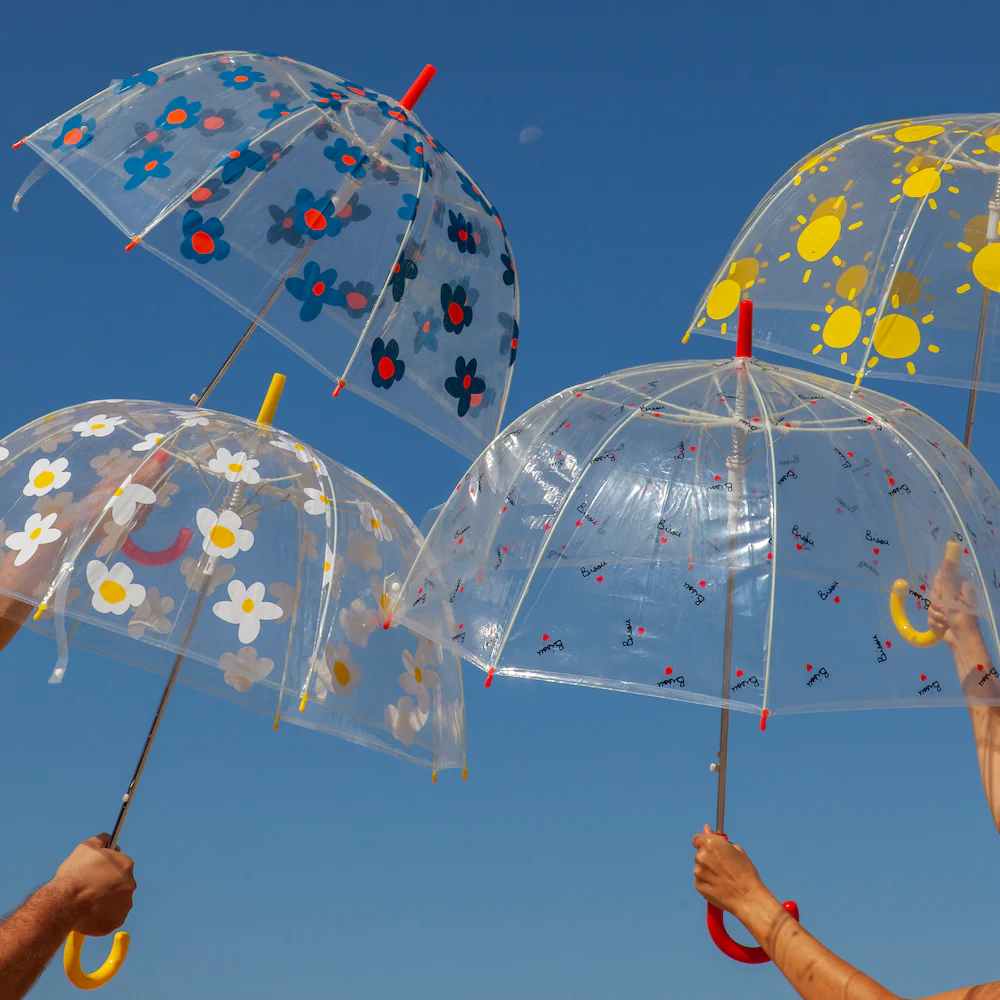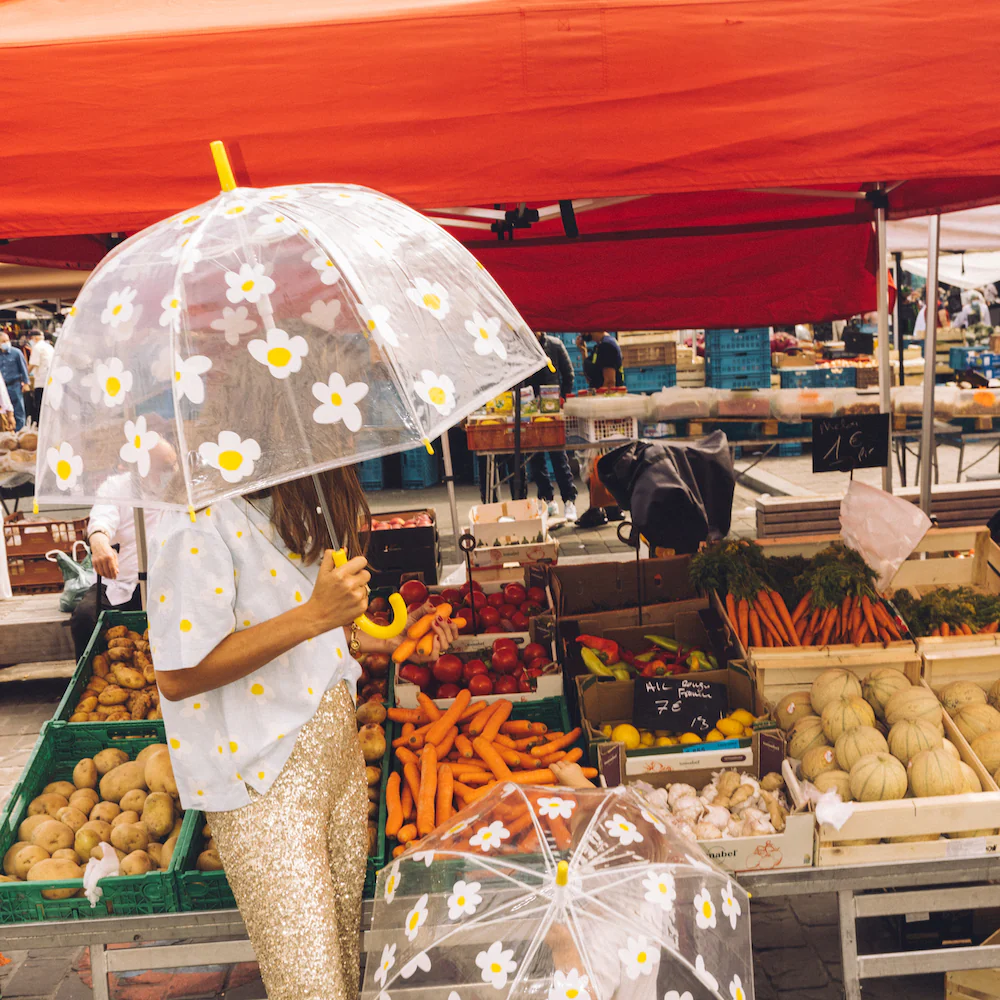 Vous avez adoré les marguerites sur le papier peint, le pyjama, le cabas : BAM, elle envahissent désormais nos supers parapluies transparents pour les petits et grands. Nos parapluies sont hyper résistants aux coups de vent, pluies torrentielles, tempêtes et tornades dans nos vies. Le PVC transparent est très durable dans le temps. Il ne se déchire pas au moindre accroc et pour le garder plus beau, plus longtemps, n’hésitez pas à le nettoyer de temps en temps avec un linge humide pour retirer les traces éventuelles.