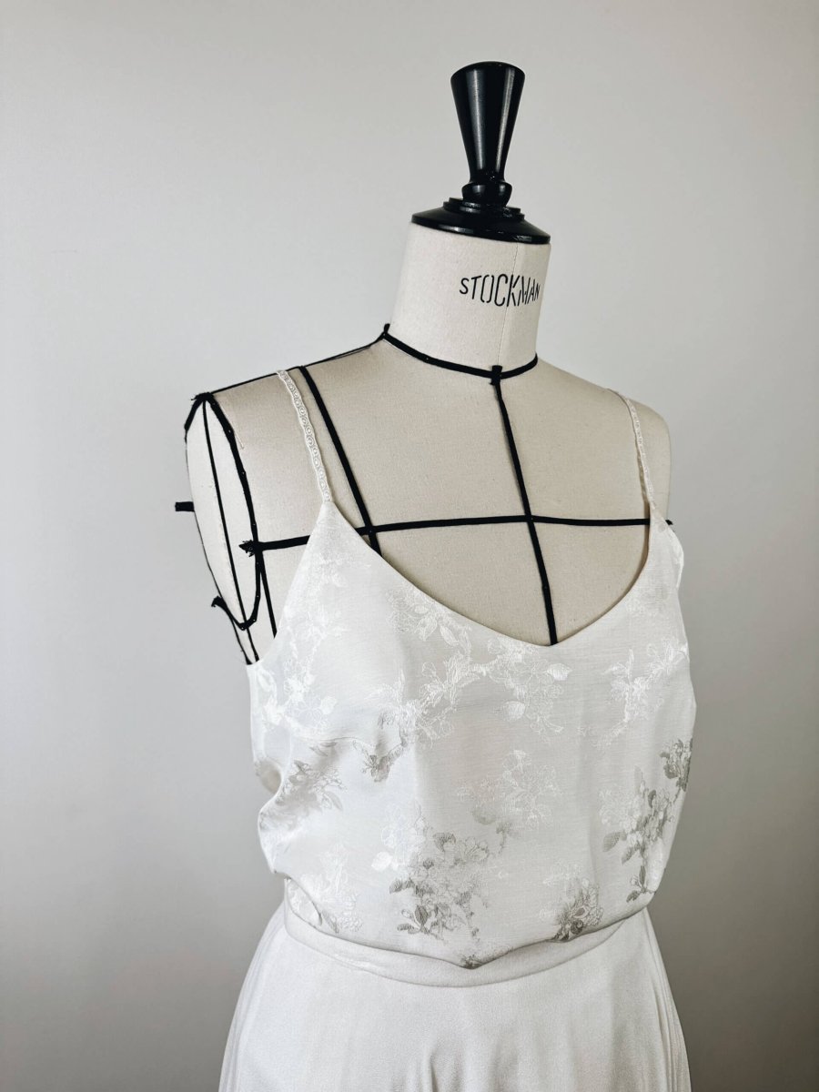 Conçu sur le modèle POUDRE : simplicité de la coupe et raffinement des matières pour ce top en tissu Jacquard, entièrement doublé en satin de soie, et d’une douceur incomparable ! Ses fines bretelles aux reflets argentés lui apportent une touche de lumière et un détail chic unique.