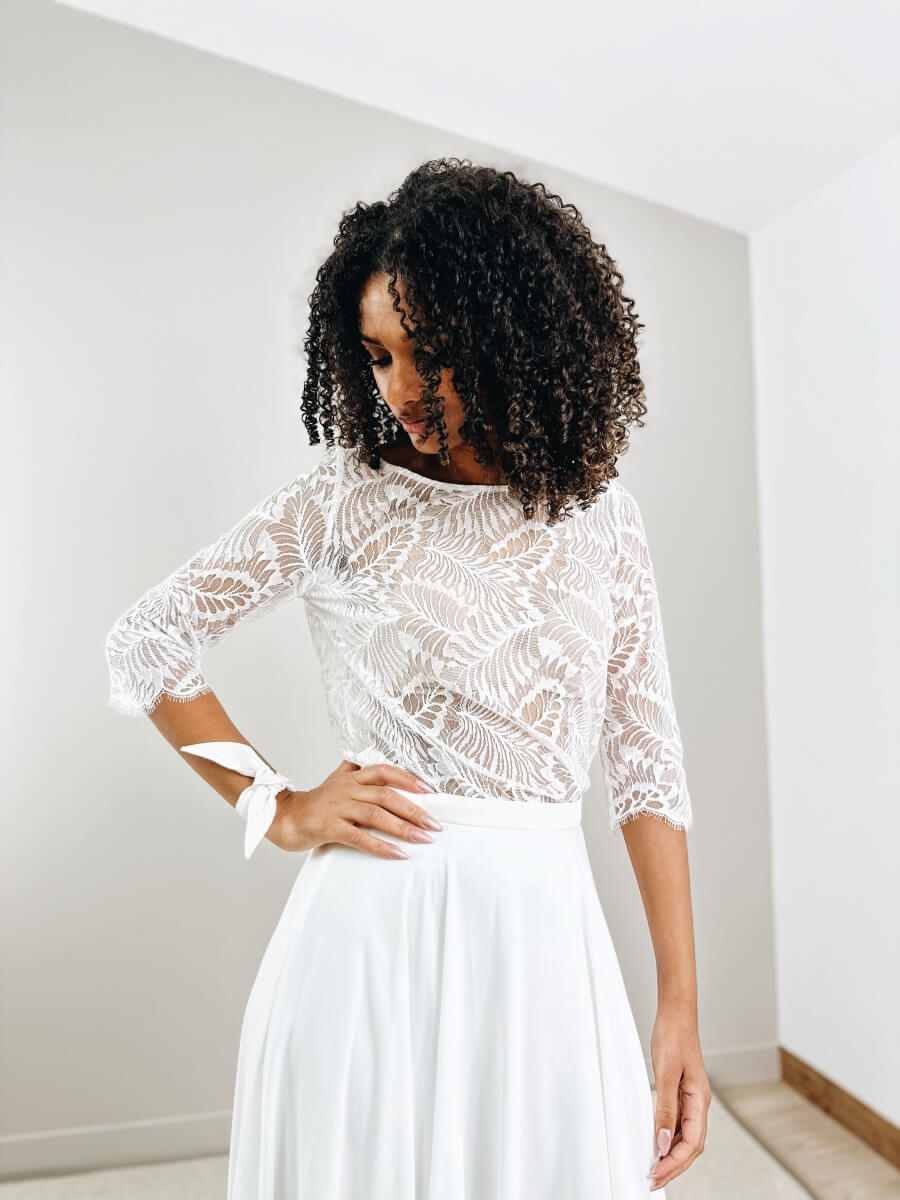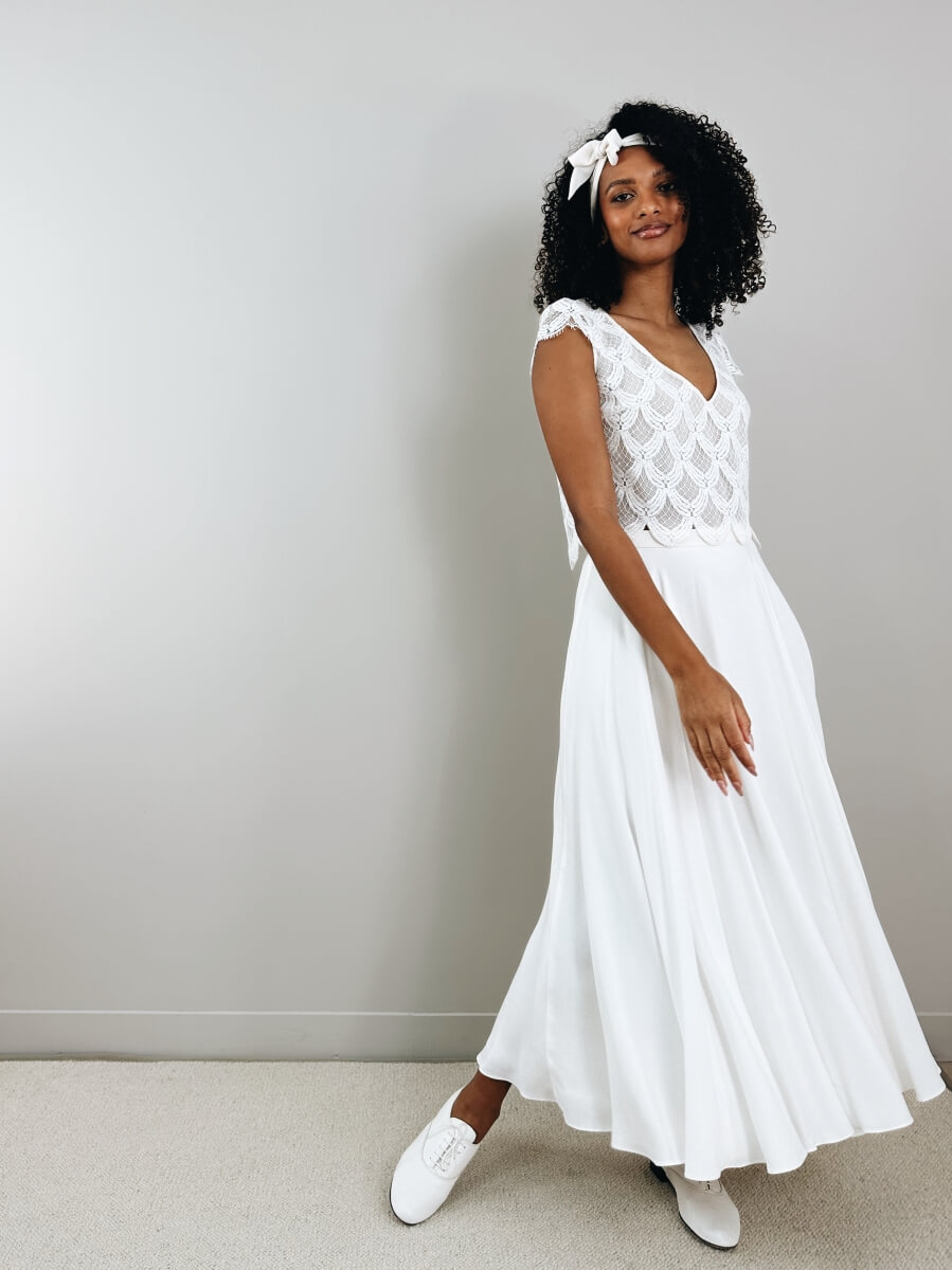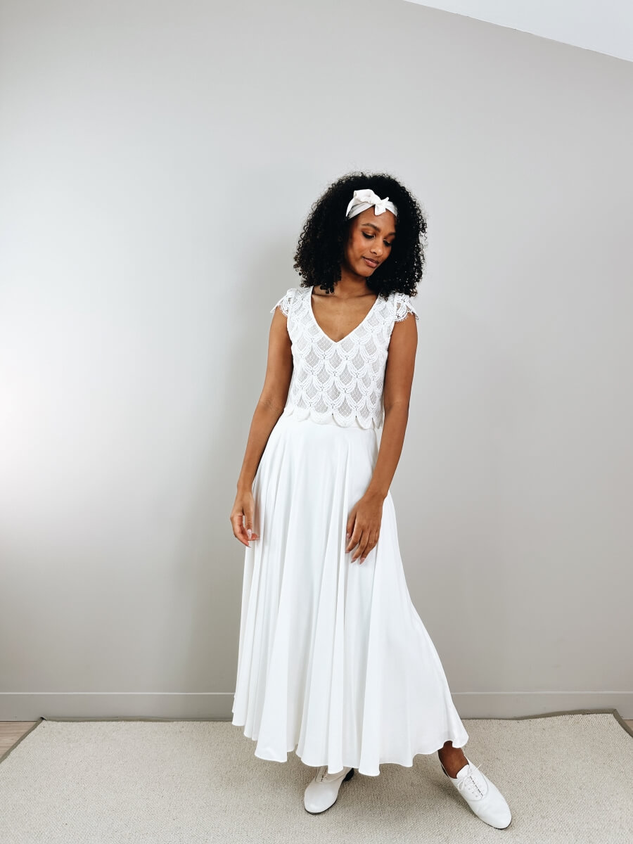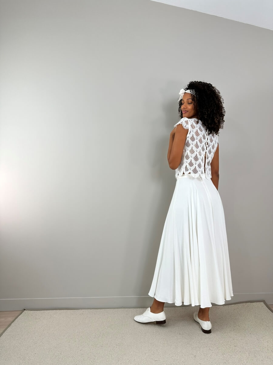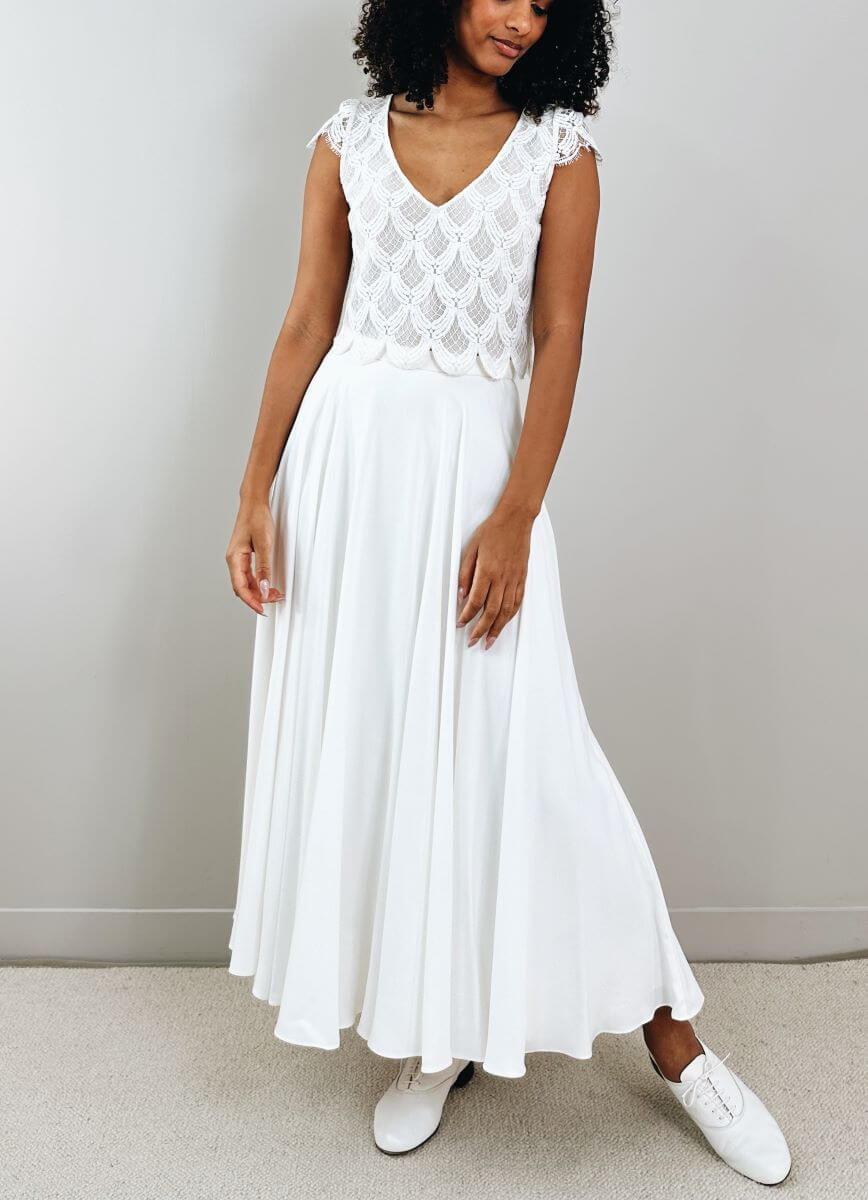 La jupe de mariée parfaite en toute occasion !! Son crêpe fluide, d’une densité moyenne lui confère de la tenue ET du mouvement en mettant en valeur toutes les silhouettes. Un must intemporel très facile à reporter avec le reste de votre garde-robe.
