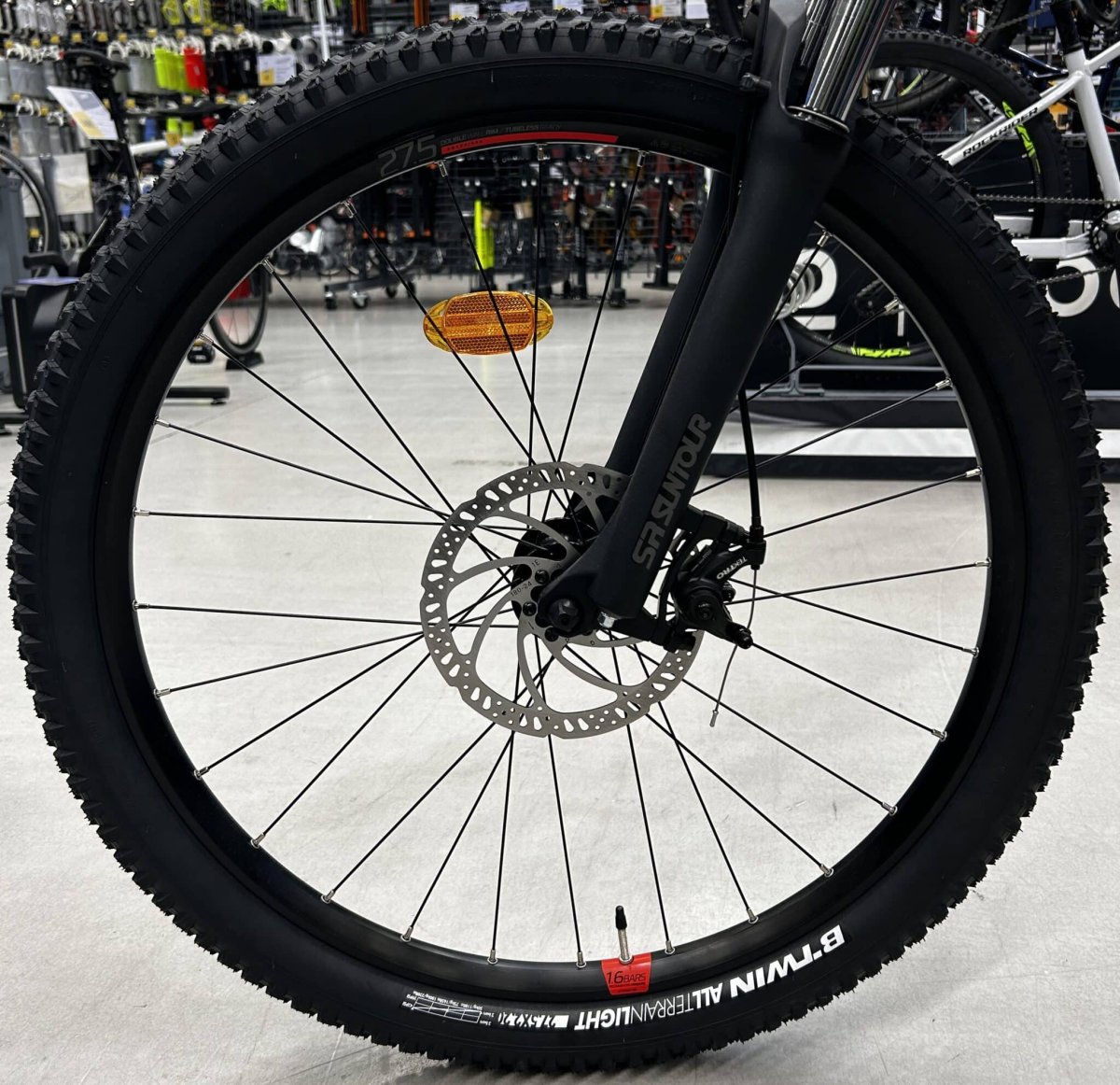 Les freins à disque mécaniques Tektro TKD68, avec des disques de 180 mm, assurent un freinage puissant et réactif. Les pneus Rockrider All Terrain Light en section large de 2.2 pouces garantissent une excellente adhérence sur tous types de terrains. En outre, les bandes réfléchissantes sur les flancs des pneus augmentent la visibilité nocturne.