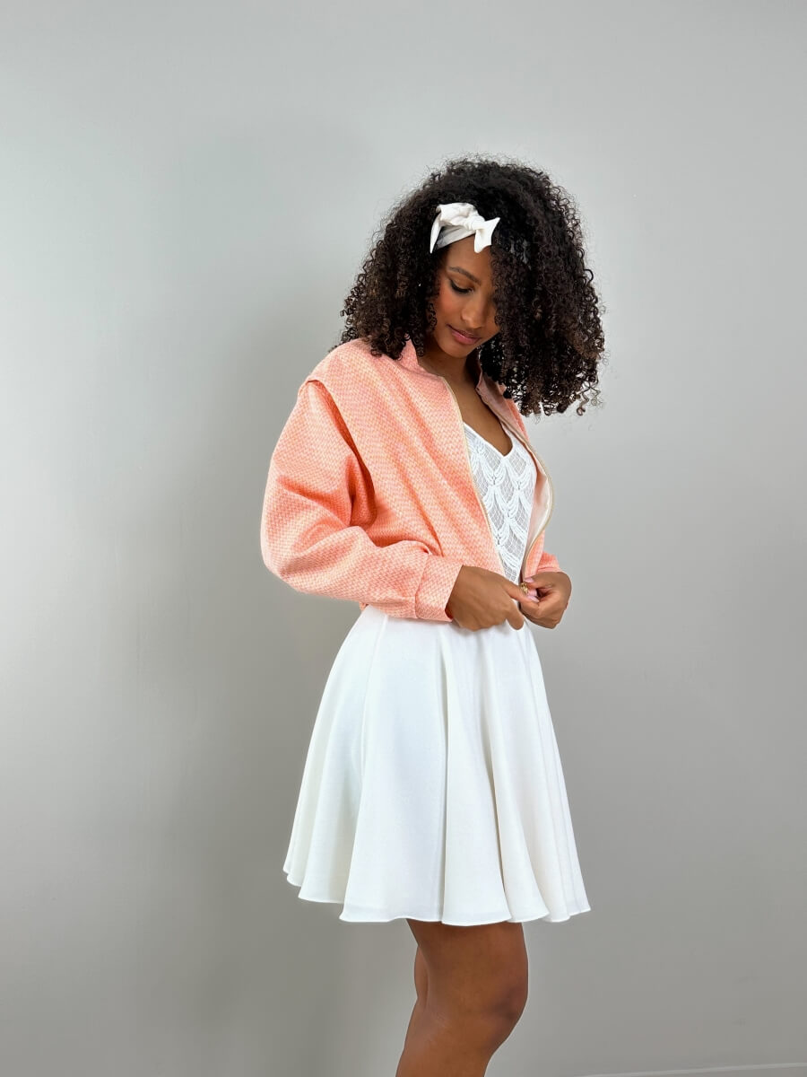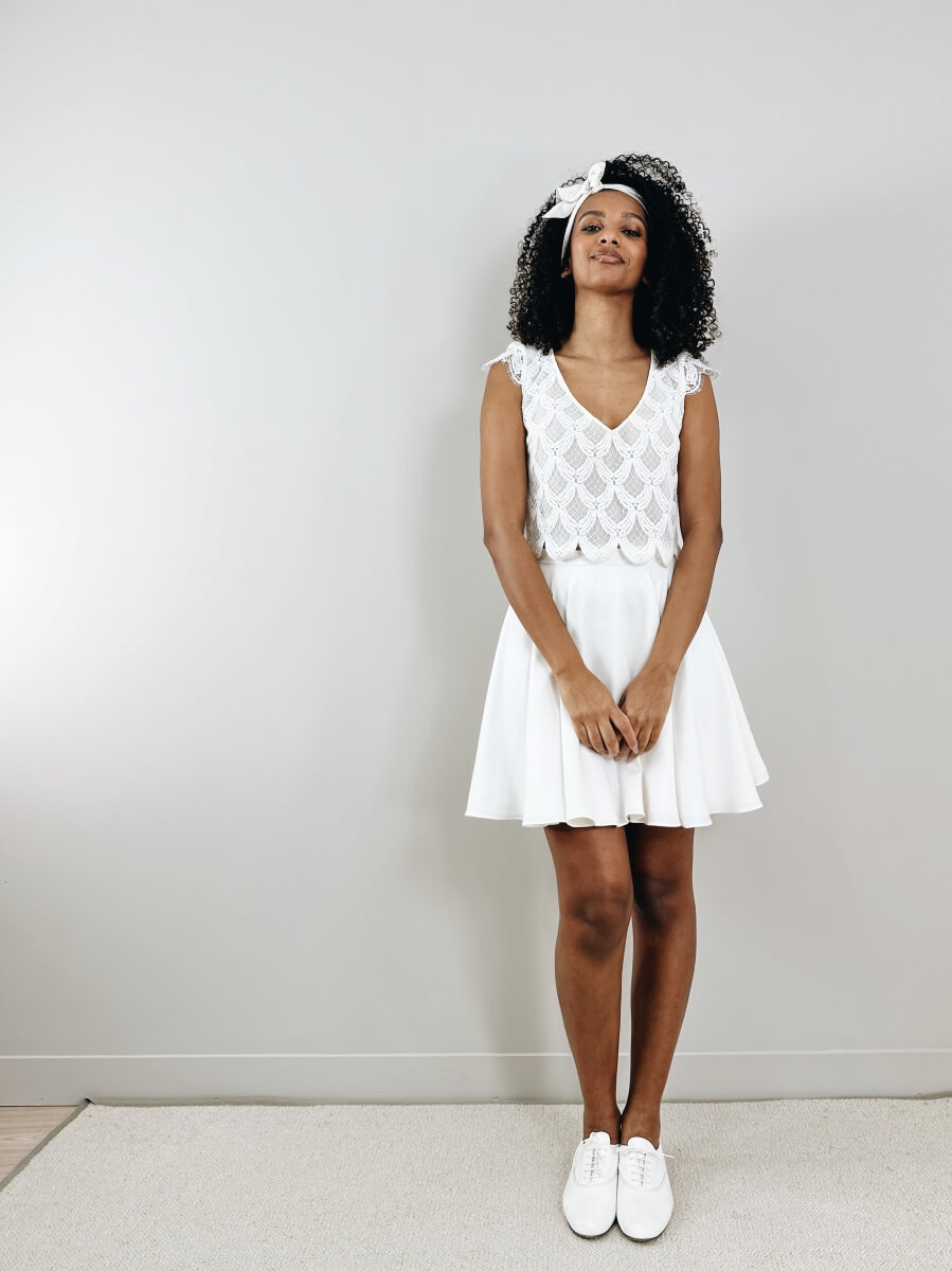 La jupe mini coupe soleil (ou patineuse), parfaite pour un mariage civil ou le brunch du lendemain. Son beau crêpe viscose Ecovero, issu de stocks dormants, est lumineux et très fluide. Sa coupe évasée danse avec légèreté pour mettre en valeur la silhouette.