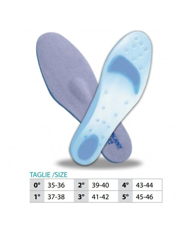 Cette semelle Orione en silicone perforé recouverte de tissu élastique présente un point de relief dans la région métatarsienne/calcanéenne, un b coussinet métatarsien intégré et un support longitudinal pour l’arc.
