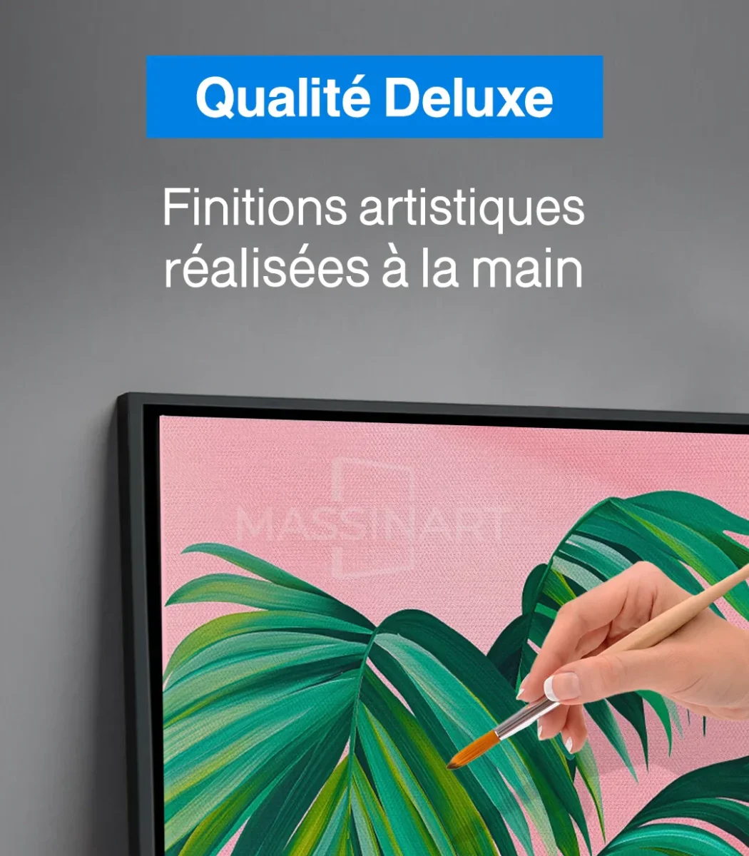 Découvrez nos tableaux exclusifs sur massinart.ma, alliant artisanat et modernité pour sublimer vos espaces. Chaque tableau est conçu à partir d’un châssis de 3 cm et d’une toile canvas artistique en coton (80 %), fabriquée en Allemagne. L’impression est réalisée en haute résolution avec des encres écologiques et sans odeur, garantissant une qualité exceptionnelle.